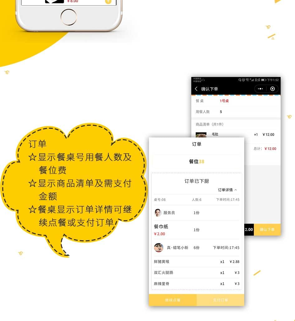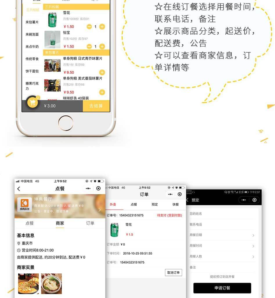 单店外卖、多店营销、商家展示、商家定位、订单提醒、模板消息、扫码点餐、预约桌位、预定菜品、扫码付款、在线点餐、分销系统、排队取号、支付收银、商家入驻、打印机支持、会员卡、优惠券功能、报表统计、积分商城、余额充值、店铺评论